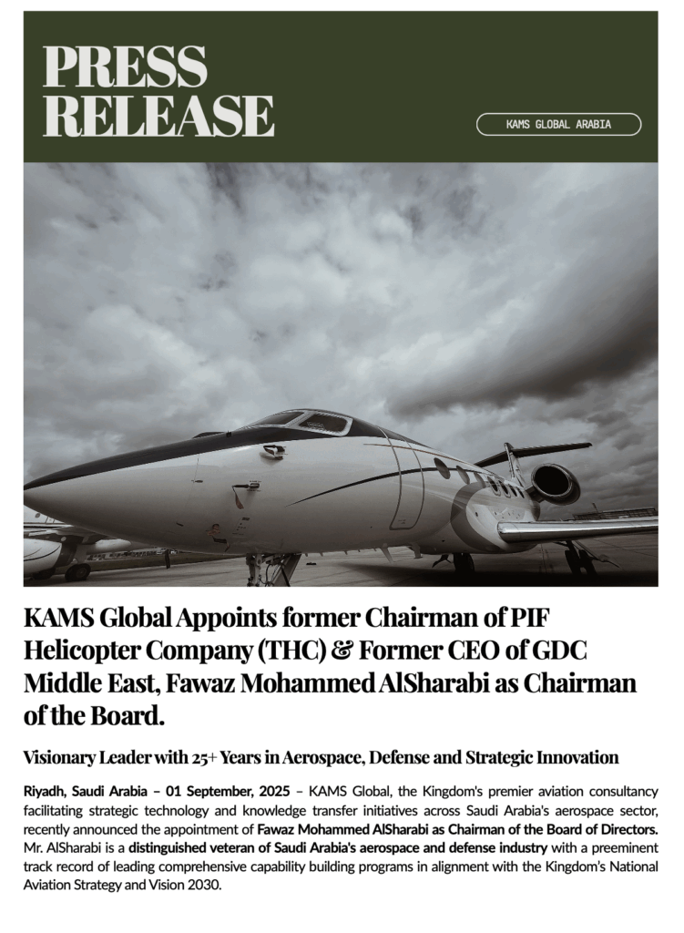 KAMS Global Appoints former Chairman of PIF Helicopter Company (THC) & Former CEO of GDC Middle East, Fawaz Mohammed AlSharabi as Chairman of the Board.